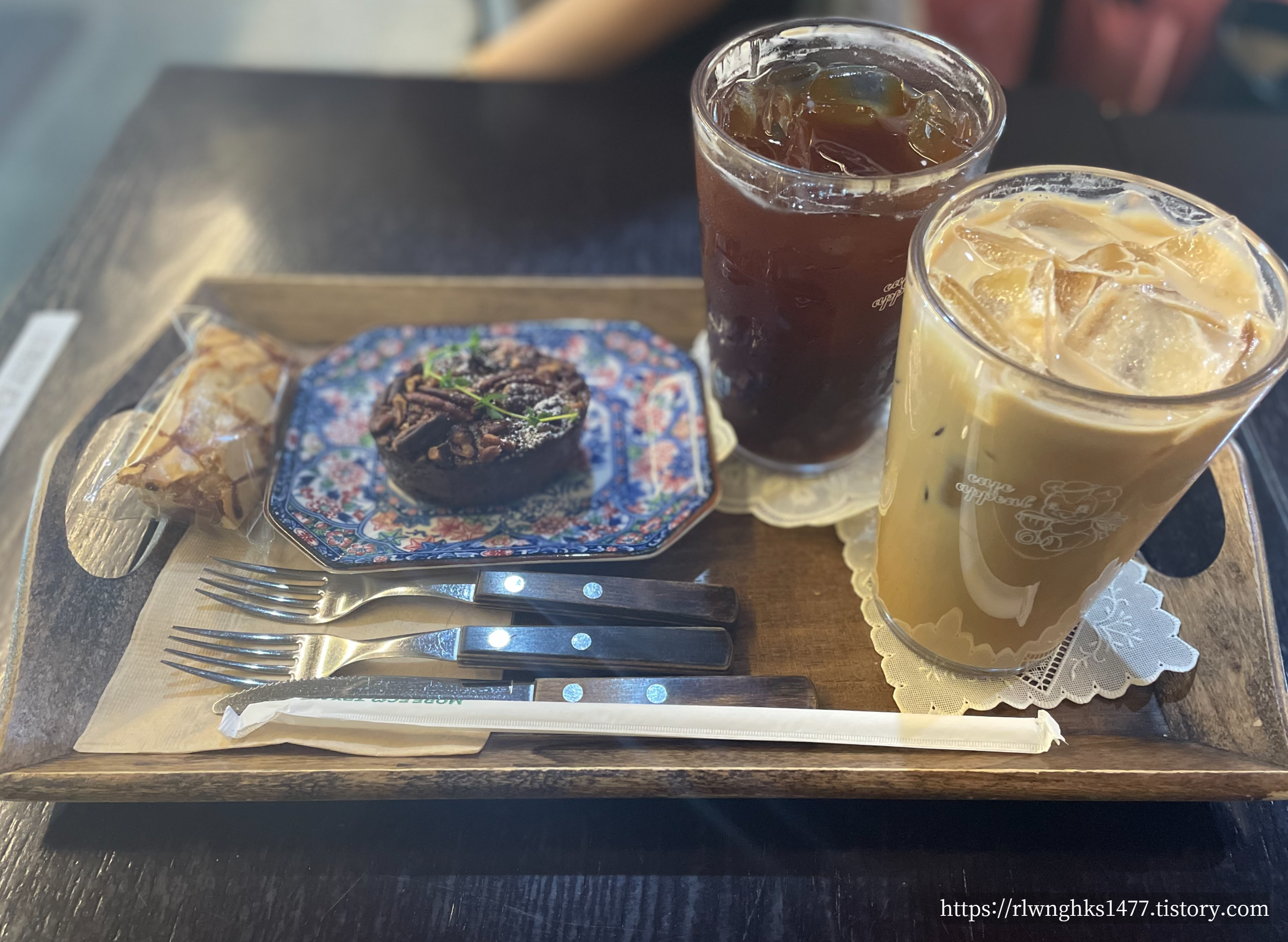 저희는 아이스 아메리카노와 연유라떼, 누네띠네 휘낭시에, 피칸파이를 시켰어요!! 조용하고 작지만 디저트 종류들도 많고 음료들 역시 다양했습니다.